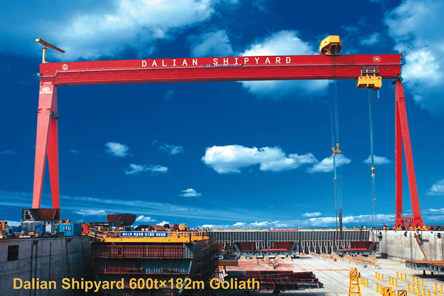 造船門式起重機是一種大起重量、大跨度,多功能、高效率的門式起重機,專用于船塢或船臺進行大型船體分段、對接及翻轉作業。 大連重工自1999年研制出全變頻調速造船門式起重機以來,積累了豐富的機電設計、結構分析計算、制造、運輸、安裝和調試經驗,形成了自主的核心技術,至今已研制了200—800噸等不同規格的造船門式起重機。